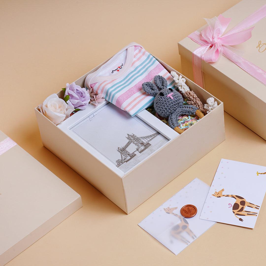Celebrate the birth of a blessing with this thoughtful hamper. A romper in soft stripes for the baby’s early days and a handmade toy to keep for the memory. Capture most of the memories by keeping a photo in the frame and immortalizing it.
