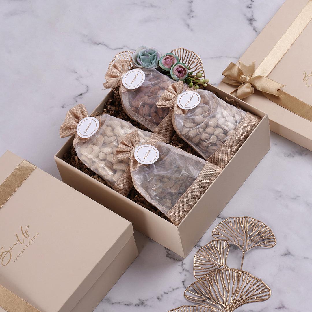 Dry fruits have been an eternal part of Diwali and we all know they are here to stay! One can never go wrong with a box of decadent and rich dry fruits as Diwali gifts. This Nutty Diwali hamper comes with four bags of rich dry fruits – pistachios, cashews, almonds and raisins. These dry fruits come in reusable jute bags that have clear windows on them that let you see the contents of the bag. Once you have enjoyed the decadent nuts, you can reuse them to stash away jewelry, keys and other knickknacks! The dry fruits come in an elegant cream color box that is also reusable.