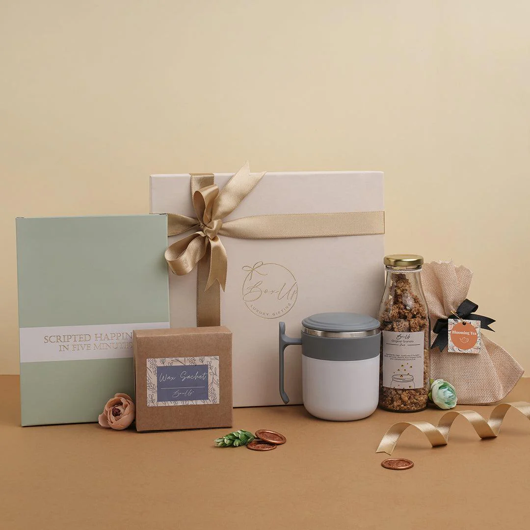 Made for a soothing evening in, this hamper has all the products that will help one unwind after a long day. The hamper has a “Scripted Happiness in five minutes” journal – it’s a guided journal that is perfect if one is looking to start journaling. Along with the journal, the hamper also comes with a jar of healthy granola, a travel-friendly coffee mug with lid, set of two wax sachet and a bud of soothing blooming tea. The hamper is perfect to set up a journaling habit!