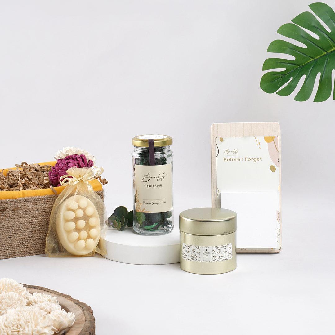 With its bright yellow fabric that reminds us of sunshine and happiness, this little hamper is here to be the light in your loved one’s life! The basket comes with a drawstring that can be used to keep the box's contents intact and dust free. This hamper comes with a magnetic post it boards that one can use to jot down the important stuff, a tin of aromatic tea leaves, a handmade massage soap bar and a jar of potpourri. This little basket of sunshine is apt for any occasion and for anyone!